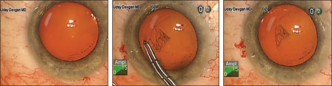 Figure 2. A tilted eye resulted in a partially completed capsulorhexis where only the right half of the anterior lens capsule was cut with the laser (Frame 1). Forceps are used to manually finish the left half of the capsulorhexis (Frame 2) which results in a normal, round, complete capsulorhexis (Frame 3). COURTESY OF UDAY DEVGAN, MD