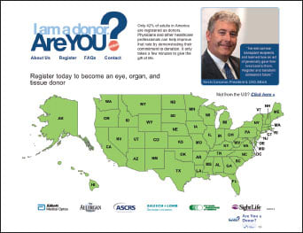 | That's the provocative question posed by SightLife, a nonprofit that seeks to encourage ophthalmologists to sign up to be organ and tissue donors themselves — and, in the process, inspire their patients to do the same. At the recent ASCRS conference, SightLife launched the “Are You a Donor?” campaign, which garnered support from prominent industry players including AMO, Bausch + Lomb, the Allergan Foundation, ASCRS and the Eye Bank Association of America. AMO encourages others in the ophthalmology community to also join in this extremely beneficial program. “We saw an opportunity to partner with SightLife to engage physicians in promoting eye, organ and tissue donation and affirming their personal commitment to help those in need,” commented Jim Mazzo, President of Abbott Medical Optics. To learn more, visit areyouadonor.org.