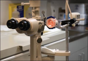 Figure 1. A donor cornea is evaluated in the slit lamp. COURTESY OF THE LION'S EYE INSTITUTE FOR TRANSPLANT & RESEARCH