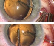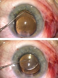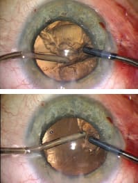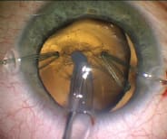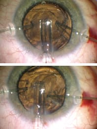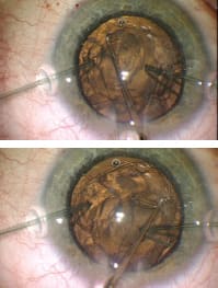 With these patients, a two-step lens removal approach is preferable. First, partial aspiration of the lens bag content is performed to debulk the lens and expand the capsular bag (Figure 7). Then, the modified CTR is implanted and sutured to the sclera followed by irrigation-aspiration of the residual lens material.