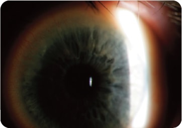 Figure 2. Slit lamp photograph of the right eye, broad beam, demonstrating a sector of inflammation at the 3 o'clock position with active ulceration and moderate thinning. A prior corneal patch graft can be partially visualized at the 9 o'clock position.