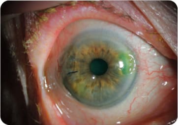 Patient presentation can vary greatly but the severity of symptoms often mirrors systemic disease activity. Although PUK can be bilateral and extensive, it's more often unilateral or asymmetric in its presentation, and the pathology is limited to one sector of the peripheral cornea.4 More common complaints include redness, pain, pain with eye movements (suggestive of associated scleritis), blurred vision, photophobia and tearing. Slit lamp examination often reveals an area of injection with variable degrees of vasco-occlusion. The corneal changes are confined to an area within approximately 2 mm of the limbus (Figure 2). The variation in corneal findings likely represents different stages in the disease spectrum with stromal infiltration, epithelial ulceration, and keratolysis with thinning being the most common. Other signs of anterior and posterior segment inflammation and vasculitis may also be seen.