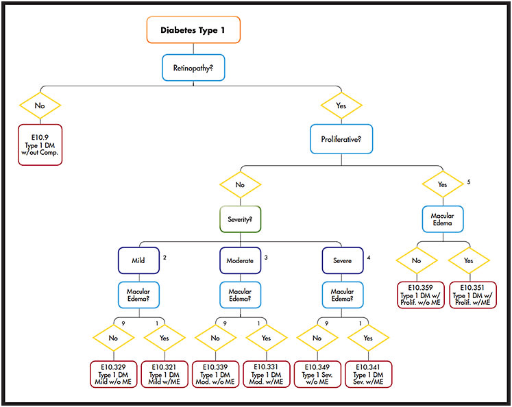 The Academy’s ICD-10 decision tree for type 1 diabetes. The full decision tree is available at tinyurl.com/AAO-ICD10-FlowChart.