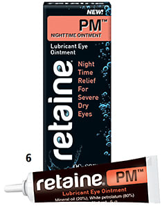 6 Retain PM preservative-free, oil-based dry eye relief ointment, from OCuSOFT, is designed to keep eyes lubricated in sleep. Retain PM is packaged in a 5-g tube.