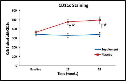 Inflammation did not progress in the supplement group, while it continued to progress in placebo. In the placebo group, CD11c intensity was significantly elevated at 12 and 24 weeks (P= 0.004) and HLA-DR intensity was significantly higher at 24 weeks (P=0.03). At study’s end, the placebo group had significantly increased intensity for both biomarkers (P= 0.001) compared to the supplement group.