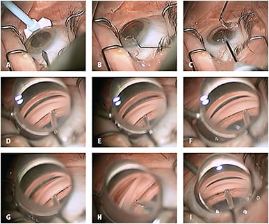 G) Depress the foot pedal completely to activate aspiration and ablation, advance the tip within Schlemm’s canal following the natural arc in one direction, going as far feasible, (H) here nearing the 12 o’clock position, then (I) disengage and ablate in the opposite direction.