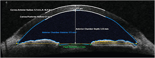 Figure 1. Anterior-segment OCT can measure a number of important parameters of the anterior chamber, such as depth and volume and pupil diameter, and cornea, including thickness, radius of curvature and distance between scleral spurs.