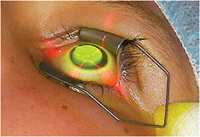 Keraflex microwave procedure one day postoperatively. Note the ring and riboflavin during crosslinking procedure.