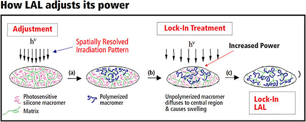 What makes the LAL different are special biocompatible materials, called macromers, incorporated into its makeup. These materials are sensitive to ultraviolet light of a certain wavelength. When the light irradiates them, the macromers undergo photopolymerization. This subsequently leads to a predictable change in the shape of the surface of the LAL and hence, its power.