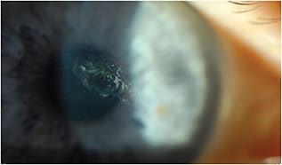The pathology in most cases is located in the central cornea just below the pupillary axis.7 A history of traumatic corneal abrasion in the same eye, similar painful episodes in the past in either eye, family members with RCE and presence of map lines, fingerprints or microcysts in the cornea of either are also strongly suggestive of RCE.
