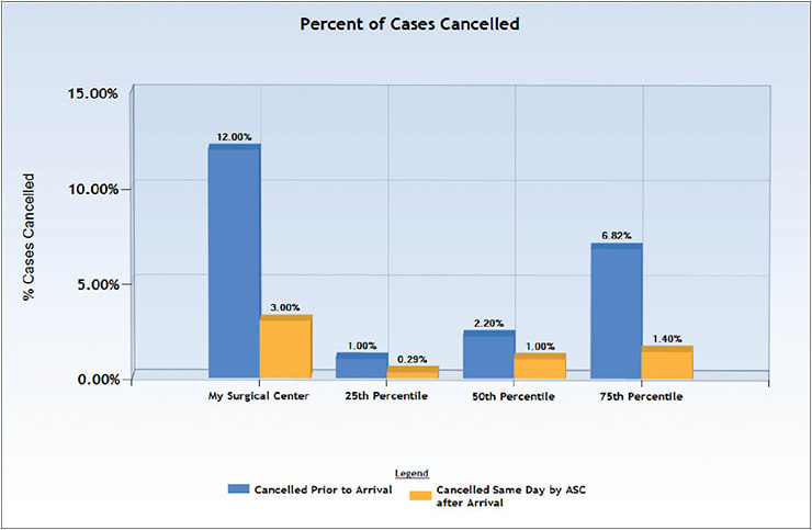 Castillo explains that an increasingly important issue for the San Antonio Eye Center and other ASCs around the nation is positioning and managing the business in the context of managed care organizations. “Reimbursement tends to be lower in areas where many managed care companies are operating, but because we have the performance metrics at our disposal, we know whether or not there’s room to improve key financials, such as our cost per case, so as we’re negotiating our contracts, we know what we can and cannot accept as reimbursement,” he says. Castillo also cites a recent specific example of how benchmarking data led to a concrete improvement in performance for the San Antonio Eye Center. The OOSS survey data revealed that the center’s 12% rate of procedures canceled prior to the patient’s arrival was well above the average rate of 2.20% (Figure 3). “Once we discovered the problem, we took a much closer look at that 12% of cases,” Castillo says. “We learned that 50% of those patients canceled prior to surgery for other health-related issues, something we wouldn’t be able to do much, if anything, about. However, the other 50% canceled because they had difficulty getting in to see their primary care physician to be cleared for cataract surgery. This prompted us to ask ourselves three questions:
