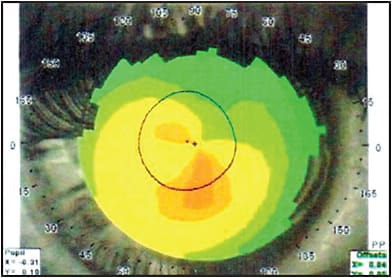 In cases where the cone is located inferiorly or inferotemporally and the refractive error includes a large amount of regular astigmatism in addition to the irregular astigmatism found in keratoconus, we will use a single inferior ring only. If the refractive error is mild and we think we can improve vision by improving the spherical equivalent, we will use two asymmetric rings: typically a 0.45 µm ring inferiorly and a 0.25 µm ring superiorly. Visual improvement is usually due to reduction in the irregular astigmatism as demonstrated by a decrease in higher-order aberrations on wavefront analysis.4,5