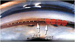 The SLT spots (400 μm) can be placed in the area of the meshwork while the ALT spots (only 50 μm) must be precisely placed to avoid peripheral anterior synechia.