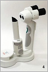4 Kowa’s SL-17 handheld portable slit lamp features one-touch selection of 10x or 16x magnification along with three slit widths and three aperature diameters. Equipped with an LED lamp, the SL-17 is cordless and rechargeable to aid off-site examinations. Also, its digital camera/video function can be used with an optional camera adapter.