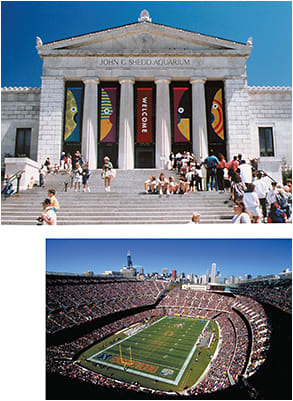 Entrance to the Shedd Aquarium (top) — the largest indoor marine mammal facility in the world. Soldier Field (bottom): Home of the Chicago Bears