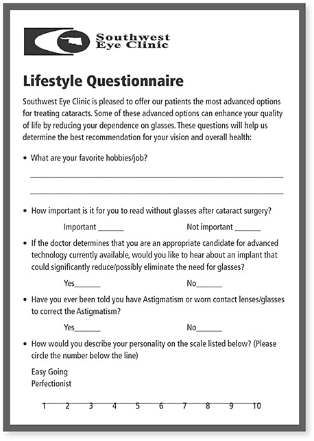 To complement the premium IOL presentation, we send information packets to cataract patients prior to their appointments. This packet includes a questionnaire that helps establish whether they would be interested in upgrading to a premium IOL while setting the stage for proper expectations. In addition, patients receive an information sheet that explains the premium lens technology (See “Patient Lens Options for Cataract Surgery,” page 34 and “Lifestyle Questionnaire,” right.)