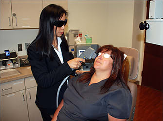 Dr. Shen administers IPL to a dry-eye patient. Note that the eyes of both physician and patient are protected.