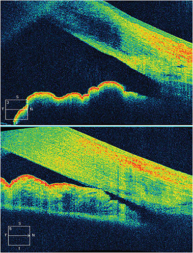Figure 1. While gonioscopy remains the gold standard, optical coherence tomography can provide objective and illustrative characterizations of the angle. The top image demonstrates a normal, open angle while the bottom image demonstrates a closed angle with iris in contact with the peripheral cornea.