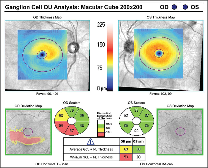 Figure 3. A macular OCT scan with ganglion cell analysis demonstrates an inferior nerve fiber layer and ganglion cell defect in the right and a normal result on the left.
