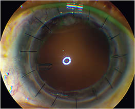 Figure 4. Corneal disease may occur in eyes that have undergone tube shunt placement. This image demonstrates an aphakic eye with a clear corneal transplant and a tube shunt placed inside of the eye.