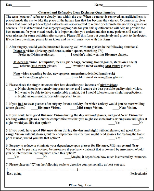 Dr. Dell and his staff have developed this questionnaire, which they use to help screen patients. The questionnaire allows patients to prioritize their vision goals, and explains to them that they might have to settle for less than perfect vision, even if they opt for a premium lens.