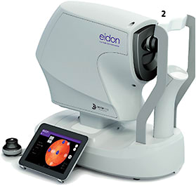 2 The Eidon true-color confocal scanner, from CenterVue, is an automated retinal imaging system. Eidon’s combination of confocal imaging and white light illumination helps provide contrast and quality imaging, the company says. The device’s optics allow imaging of the central retina and periphery over a viewing angle of up to 110 degrees. Users operate the device via its dedicated software application, which is operated as a standalone unit via a digital tablet. Eidon can be operated automatically or manually, with or without pupil dilation.