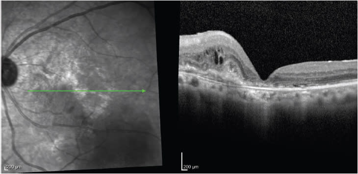 Patients age 50 or older who present with symptoms of distortion or blurred vision require careful examination, as these complaints may be due to macular pathology secondary to age-related macular degeneration. AMD is a leading cause of blindness among Americans who are 65 years or older. OCT is vital in helping to identify drusen, geographic atrophy and ellipsoid zone disruption, indicating a possible choroidal neovascular membrane, as no other imaging device is capable of this (Figure 8).