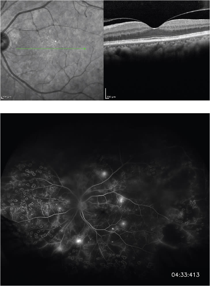 Figure 7. Top: OCT of patient with proliferative diabetic retinopathy without diabetic macular edema. Bottom: Ultra-widefield fluorescein angiography of same patient revealing proliferative neovascularization.