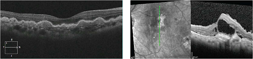 Figure 8. Left: OCT of drusen. Right: OCT of subretinal fibrosis and subretinal fluid secondary to exudative age-related macular degeneration.