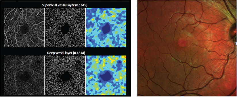 Figure 10. Left: OCT angiography revealing capillary non-perfusion despite right, normal appearing fundus image.