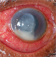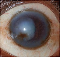 The ophthalmologic literature indicates that use of topical corticosteroids prior to diagnosis of a corneal ulcer portends a worse prognosis. One systematic review evaluated studies that assessed the use of topical corticosteroids prior to bacterial keratitis diagnosis.2 In experimental models of bacterial corneal ulcers, instituting corticosteroids prior to antibiotics generally had a deleterious effect, including enhancing the growth of stromal infiltrate with certain bacteria species. In a number of retrospective human studies, treatment with topical steroids prior to diagnosis of bacterial keratitis increased the risk of complications or treatment failure.