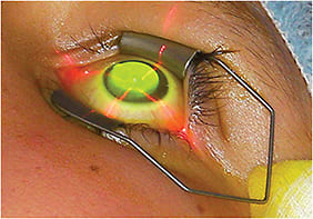 In traditional corneal cross-linking, the clinician removes the central 8 mm of the patient’s corneal epithelium to allow riboflavin to penetrate the cornea. The clinician-researcher then instills a drop of riboflavin every two minutes for 30 minutes. This is followed by application of ultraviolet radiation with continued drops every two minutes. Postoperatively, the patient receives topical antibiotic, steroid and nonsteroidal anti-inflammatory agents, plus a bandage contact lens; some patients require an oral narcotic such as Vicodin (acetaminophen and hydrocodone) for discomfort. (A growing shift to transepithelial cross-linking all but eliminates this side effect and offers other benefits; see sidebar.)