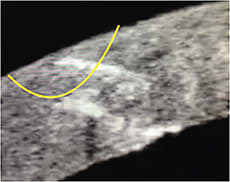 Figure 1. A refined suture technique respecting laser cuts is necessary. Here, a desired bicurved needle pass is displayed, aligning anterior side and lamellar ring cuts. See Dr. Fox’s video at ophthalmologymanagement.com for more details.