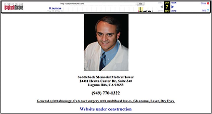 Cornea specialist George M. Salib, MD, now runs a successful private practice, called Orange County Eye Institute in Laguna Hills, Calif. It wasn’t always so. He had acquired the practice from a doctor with an excellent reputation in the community, so initially he relied on word-of-mouth and referrals to promote his practice — otherwise, his marketing efforts consisted mostly of a basic website, with an “under construction” landing page for his practice that featured his photo and phone number (Figure 1). After about a year of less-than-satisfying results from these strategies, Dr. Salib chose a new course of action: He decided to build a professionally designed, content-rich and search engine-optimized (SEO) website to win new patients for his practice. He also would have a sustained online marketing and SEO campaign that would run in his practice area.