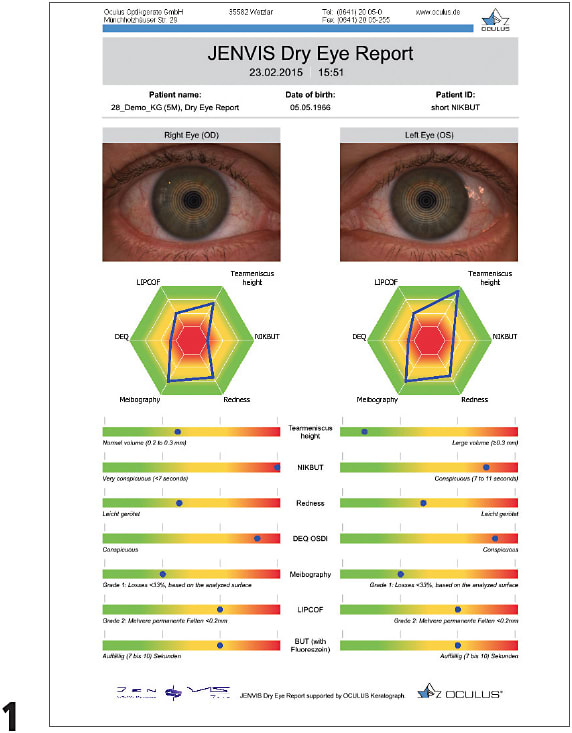 1 Developed for the Oculus Keratograph, the Jenvis Dry Eye Report assists in diagnosing dry eye. The report collects and summarizes data from a questionnaire, a slit lamp measurement of lid parallel conjunctival folds and four measurements performed with the Oculus Keratograph 5M, according to Oculus. These create an analysis of bulbar redness, measurements of tear meniscus height, tear film break-up time, and a meibography. Other screening methods, such as eye blink frequency or lipid layer analysis, also run on, and can be added to, the KeratogM.