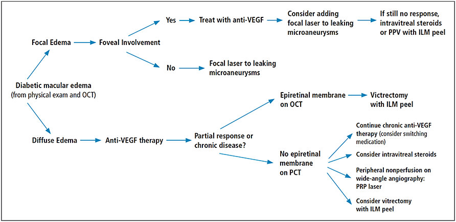 We have included a logical flowchart approach for the management of diabetic macular edema (see treatment algorithm on page 78). True, this flowchart is based on evidence-based medicine, but we recognize it is also steeped in the personal experience of the authors, and that other authorities may recommend a different approach.