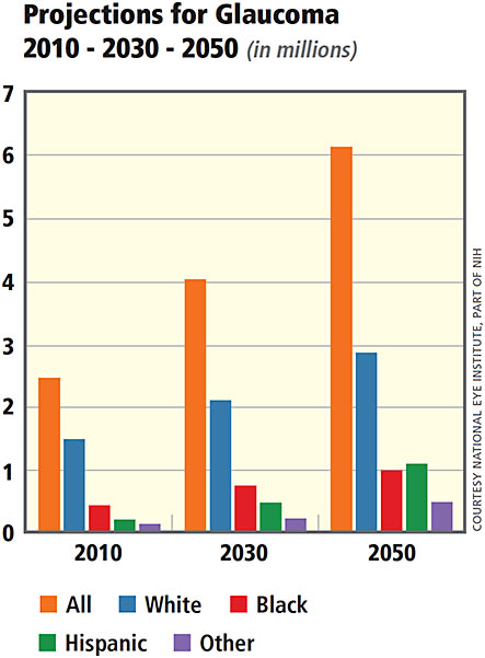 Population-based prevalence studies have shown that blacks develop glaucoma at a younger age (10 years earlier) and have an increased risk of blindness compared to whites.9 Glaucoma is the most frequent cause of bilateral blindness in Hispanics.4 Earlier detection of the disease and earlier intervention is required to reduce the risk of severe vision loss.
