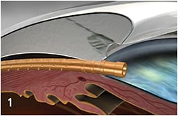 Alcon’s CyPass Micro-Stent (1) is the first FDA-approved MIGS device to target the uveoscleral pathway/suprachoroidal space to increase aqueous humor outflow and decrease IOP. It’s approved for treating patients with mild to moderate primary open-angle glaucoma in conjunction with cataract surgery, and can reduce the use of drops.