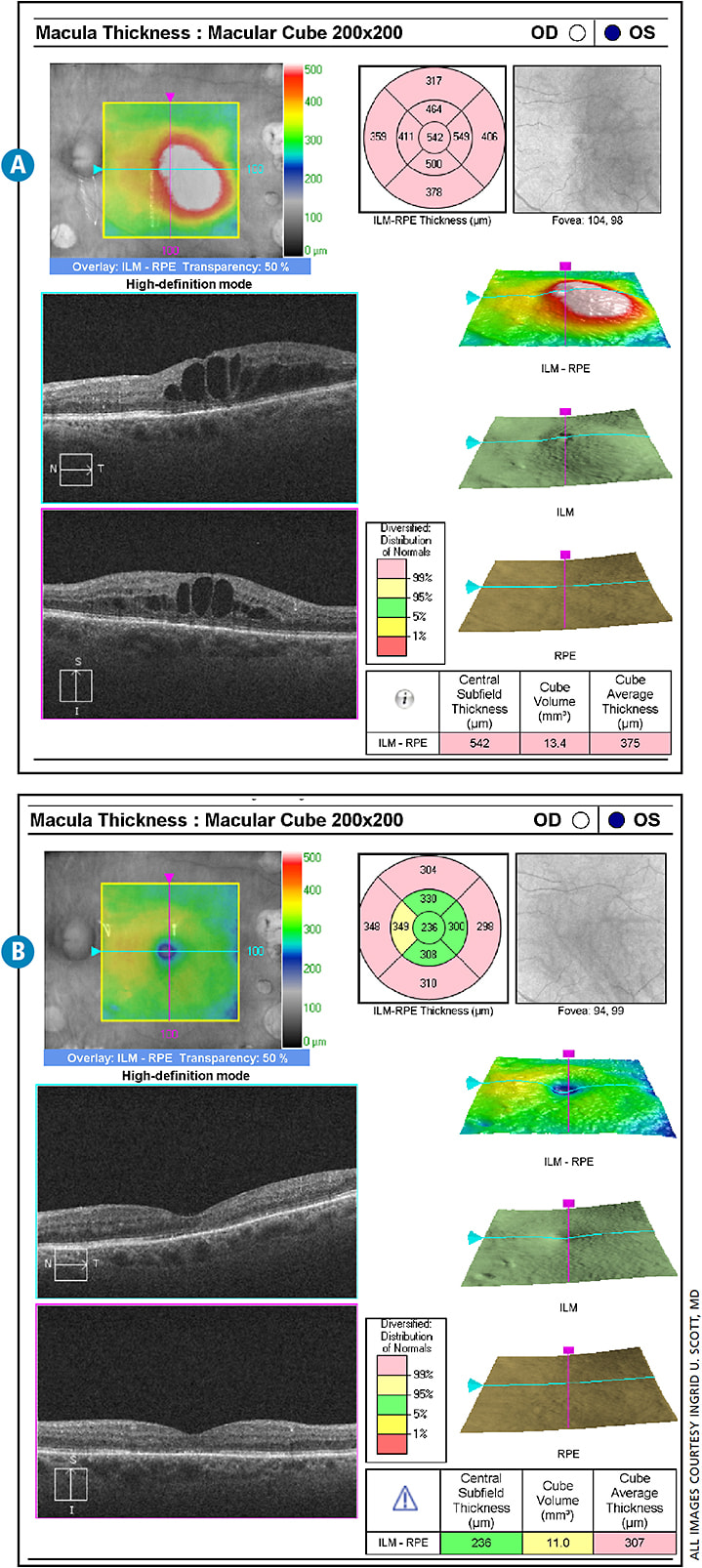 Figures: A 67-year-old woman with type 1 diabetes mellitus and a history of quiescent proliferative diabetic retinopathy (status-post panretinal photocoagulation) presented with recurrent diabetic macular edema OS. In the past, she responded poorly to anti-VEGF agents. At presentation (A), best-corrected visual acuity was 20/50 OS and optical coherence tomography demonstrated macular edema. The patient was treated with a dexamethasone delivery system (Ozurdex). One month later (B), best-corrected visual acuity improved to 20/40 OS and optical coherence tomography demonstrated substantial improvement of macular edema.
