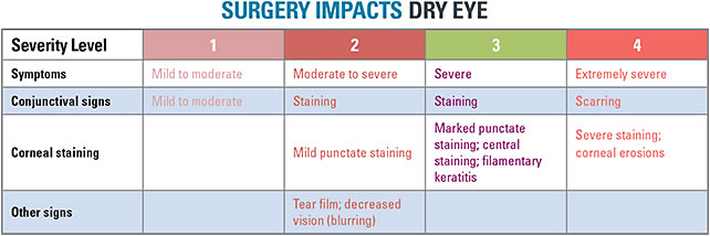 Cataract surgery is known to add one severity step to a patient’s dry eye as classified by DEWS, and LASIK is known to add two steps1 (Figure 1). Therefore, at our practice, we have zero tolerance for preoperative intraocular inflammation or posterior segment inflammation, and we find punctate keratopathy, particularly in the visual axis, as well as topographic aberrations intolerable.