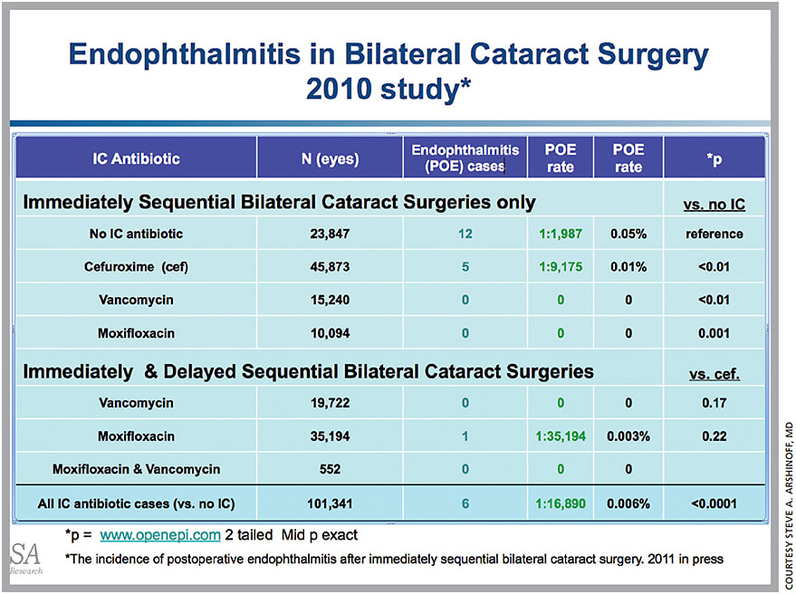 2. Arshinoff SA, Bastianelli PA. Incidence of postoperative endophthalmitis after immediate sequential bilateral cataract surgery. J Cataract Refract Surg. 2011;37:2105-14.