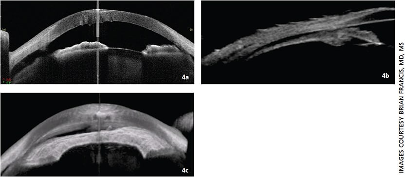 CASE 2: Figure 4a. Anterior segment OCT demonstrates disinsertion of the iris root and fluid in the suprachoroidal space. An advantage of AS-OCT is its higher resolution. You can see the areas of Descemet folds and corneal edema anterior to each fold. Figure 4b. UBM shows fluid in the suprachoroidal space entering through the cleft. The UBM also shows that the ciliary body is detached in addition to the iris root. Figure 4c. Swept Source AS-OCT combines multiple AS-OCT images to create a three-dimensional view of the cyclodialysis cleft.