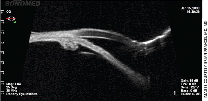 CASE 1: Figure 1. UBM image showing continued narrow angle approach with plateau iris conformation. Note the anterior placed ciliary processes that are prominent in both width and height.