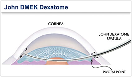 In addition, the smooth tip of the John DMEK Dexatome is designed to tear Descemet’s membrane in a single, 360-degree movement while gliding along the corneal surface — first clockwise 180 degrees, followed by counter-clockwise for the remaining 180 degrees.