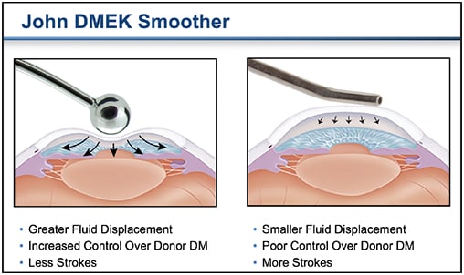 SOLUTION #2: In my experience, the John DMEK Smoother simplifies the steps of unfolding and positioning the donor Descemet’s membrane, significantly improving the ease and outcomes of DMEK. It provides better control, requires fewer manipulations than using a cannula, and offers better fluid displacement within the AC, which aids in unfolding and positioning the donor Descemet’s disc within the AC.