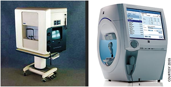 Industry continues to offer choices in perimetry technologies. A brief count includes relative newcomers: frequency doubling technology (FDT, Carl Zeiss Meditec), flicker-defined form (FDF, Heidelberg/Oculus/Haag-Streit), and short-wavelength automated perimetry (SWAP); along with the more established standard achromatic perimetry (SAP, Carl Zeiss Meditec/Heidelberg/Oculus/Haag Streit/CenterVue). Fundus perimetry (or microperimetry) has also gained traction in glaucoma management (CenterVue) after initial use in assessing macular pathology.