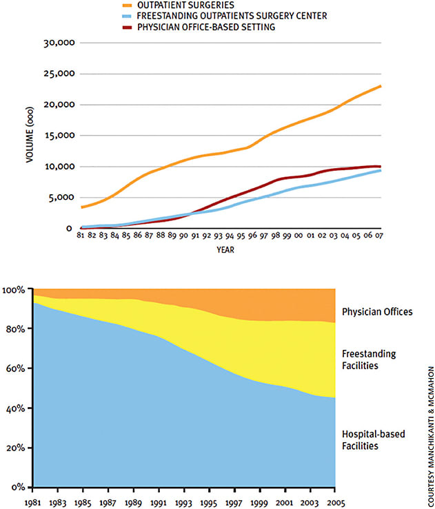 Some 5,400 ASCs were in existence in 2015; the first one opened up in 1970.1 ASC visit rates increased nearly 300% from 1996 to 2006 to 14.9 million, whereas the rate of visits to hospital outpatient surgery departments (HOPDs) remained flat at 19.9 million. In 2006, the most common diagnosis at ASCs was cataract at 3 million.3 For example, in Florida, 84% of cataract surgeries from 1997 to 2004 were performed in ASCs.4