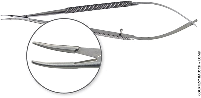 The Ayres Needle Holder Scissors by Bausch + Lomb feature a delicate jaw, tying platform and scissor to add efficiency to cataract surgical procedures requiring sutures. Designed by Brandon D. Ayres, MD.