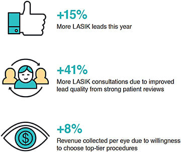 A LASIK patient tells me reviews were critical to her decision. “Cost mattered, but I especially wanted to personalize this experience. I wore contacts and had chronic irritation, and I sorted through reviews to see who had the same problem. We’re the generation using Rent-the-Runway, Blue Apron and Uber. We buy individualized solutions. I care what others like me have to say, especially with something as major as LASIK.” (Note, based on this comment, reviews may be evolving from star ratings to sortable identifiers very soon.)