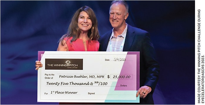 Patricia Buehler, MD, MPH, and co-founder, Knute Buehler, MD, of Bend, Ore.-based Osheru — the company they founded to develop the Ziplyft device for minimally invasive lid surgery — won first place in the Winning Pitch Challenge and a check for $25,000 for Ziplyft during Eyecelerator at ASCRS 2023 in San Diego. Osheru was one of three finalists chosen to pitch live on stage.